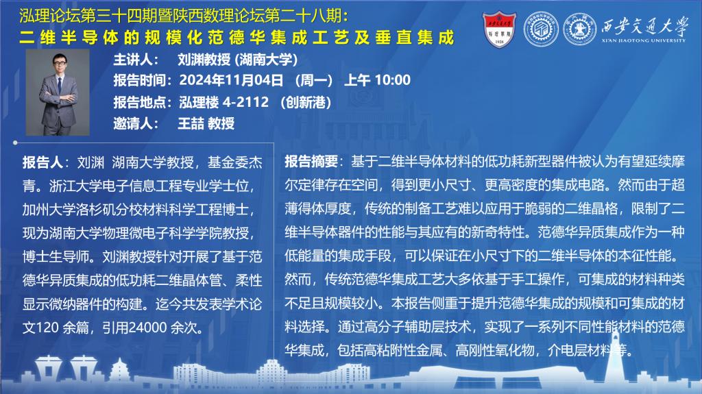 【泓理论坛第三十四期暨陕西数理论坛第二十八期】——二维半导体的规模化范德华集成工艺及垂直集成
