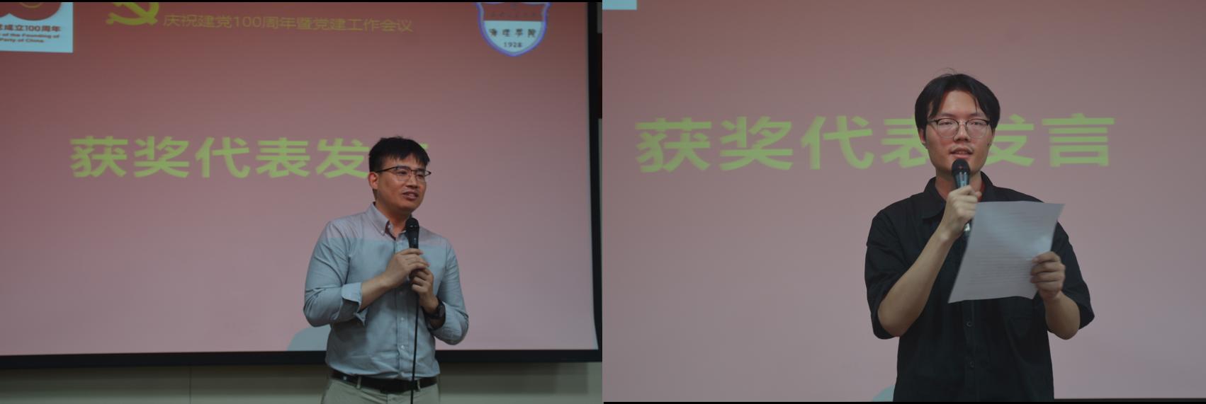 获奖代表光信息党支部栗建兴同志、硕2020级党支部张啸林同志先后发言,感谢党组织的培养和全体党员同志的信任,分享自己在学习工作中的心得体会,表示将严以律己,再接再厉,做好本职工作,为学院发展做出贡献。