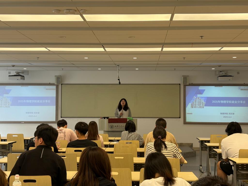 为贯彻落实学校关于做好毕业生就业工作的相关要求,进一步帮助在校生了解就业形势、明确职业规划,物理学院于6月4日上午在创新港校区4-5220和兴庆校区仲英楼B253同步举办就业经验分享会。本次活动由辅导员刘文慧主持,邀请到2025届优秀毕业生代表傅相达、刘梦瑶进行经验分享,共吸引50余名学生参加。