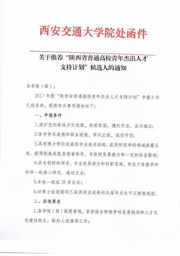 关于推荐“陕西省普通高校青年杰出人才支持计划”候选人的通知