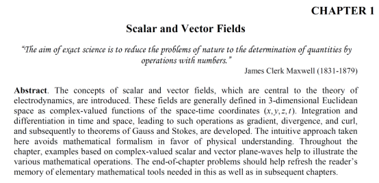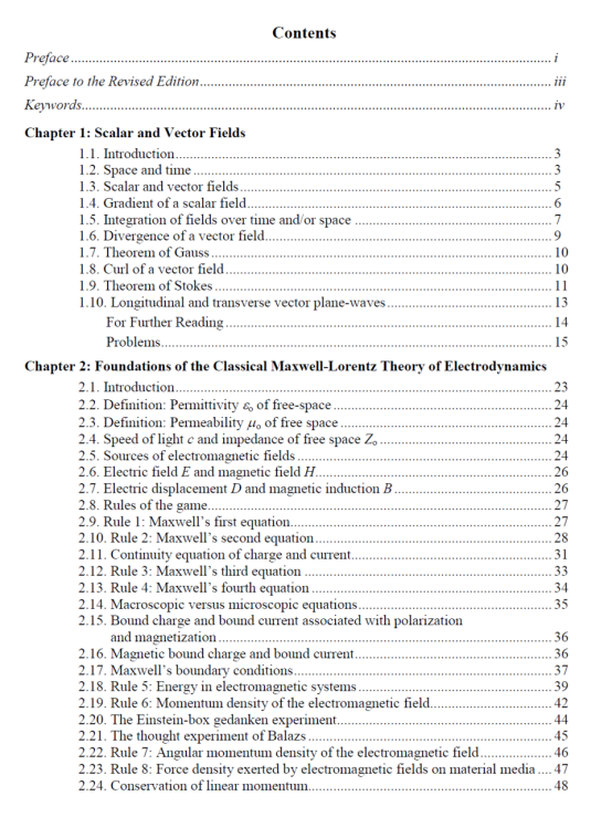 Mansuripur教授将根据他自己主编的经典教材Field, Force, Energy and Momentum in Classical Electrodynamics (Revised edition), Bentham Science Publishers (2017)中的第一章和第二章内容,形成10个讲座课程。此教材的前两章电子版将免费提供给学生使用。这两章主要是电动力学中的麦克斯韦洛伦兹经典理论的基本原理介绍,第一章是数学基础,第二章是物理定律和演绎。教授将尽可能地给学生讲清楚任何细节,使学生能够在最基础的水平理解概念和方法(所以不用担心听不懂,教授讲课会非常有趣)。在每章后,会为学生设计一些题目来练习他们最新学到的知识,鼓励学生自己解决一些问题(非必须)。下面是教材的目录以及第一章和第二章的题目和摘要。