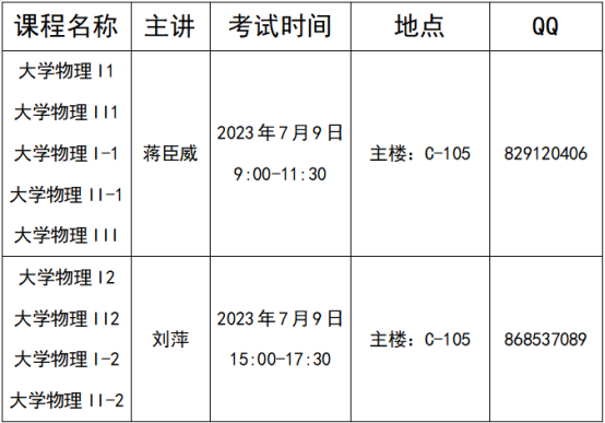 2022-2023学年夏季小学期《大学物理》系列课程重修班考试安排