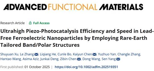 2025年10月1日,由西安交通大学物理学院张乐研究员、杨森教授及前沿科学技术研究院王栋教授领衔的TFML-MMSH跨学科研究小组,在新型压电催化材料领域取得最新突破性进展,相关成果已被国际材料科学权威期刊《Advanced Functional Materials》正式接收并在线发表。