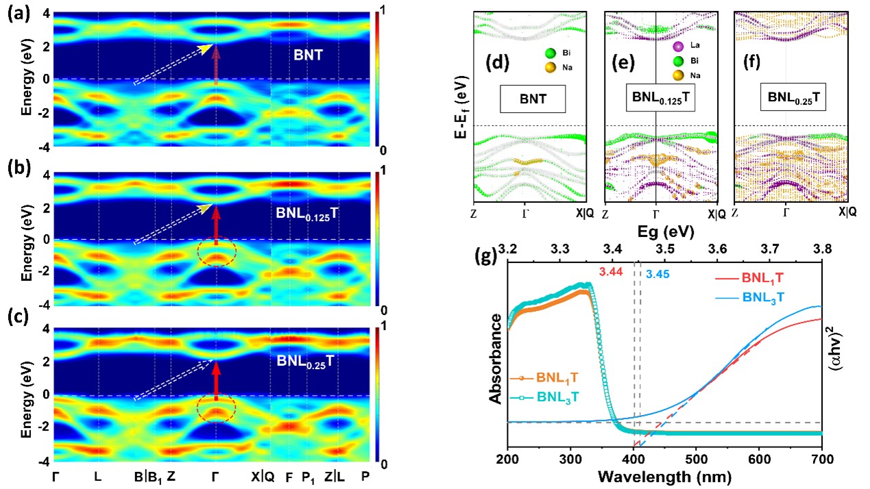 图2. BNLxT电子结构分析。(a)-(c)BNT、BNL0.125T和BNL0.25T的反折叠能带结构。(d)-(f)G点附近分别在La、Bi和Na上能带投影,对应于(d)BNT、(e)BNL0.125T和(f)BNL0.25T。(g)BNL1T和BNL3T样品的紫外-可见吸收光谱以及用于计算带隙的Tauc图。