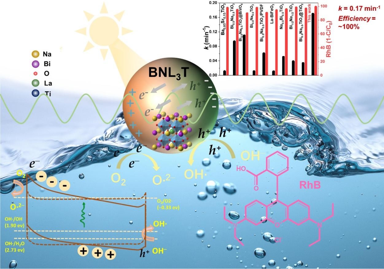 图1. BNL3T新型压电催化纳米颗粒在超声和紫外光下对RhB的降解过程。