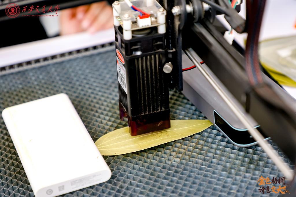 活动期间,“物理小梧桐” 盖章打卡点始终人气高涨,现场时常排起长队,师生参与热情高涨。物理学院的志愿者们化身科普使者,现场操作激光打标机,为师生们定制专属落叶纪念品。一片普通的梧桐叶,在激光的“雕琢”下,不仅能呈现出师生们喜爱的照片图案,还能精准雕刻上校徽与校训,让每一片落叶都成为独一无二的“交大记忆”。在雕刻过程中,志愿者们耐心讲解激光原理,从光的直线传播到能量的集中释放,用通俗易懂的语言将抽象的物理知识转化为生动的现场演示,吸引了众多师生驻足观看、积极提问,在轻松愉悦的氛围中传播了科学知识。