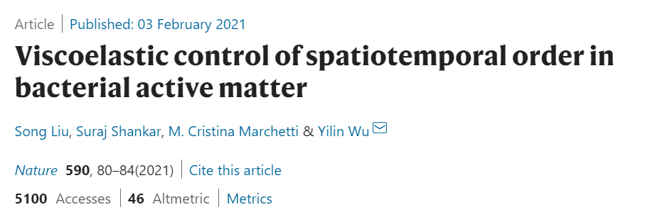 在非平衡态物质体系的研究中,有关活性物质自组织的研究快速发展。不同于平衡态物质体系,活性物质有局部的能量输入,包括从单细胞到动物的所有生命体,由分子马达驱动的生物分子,以及人工合成的自驱动物质。近日,由香港中文大学、加州大学和哈佛大学的物理学者组成的团队在这个领域取得了突破:材料的粘弹性可以控制活性流体在空间和时间上的自组织。研究成果以“Viscoelastic control of spatiotemporal order in bacterial active matter”为题,于北京时间2021年2月4日在线发表在科学期刊《自然》上,香港中文大学吴艺林教授为论文通讯作者,西安交通大学物理试验班2014届毕业生刘松为文章第一作者。