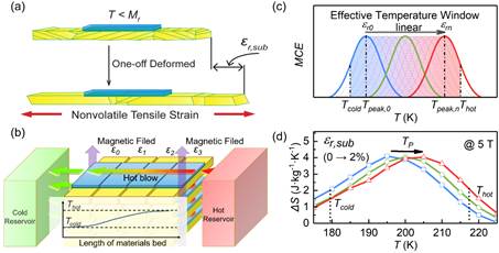 “十四五规划”指出,我国能源结构需不断调整优化,能源战略之首即为“节能提效”。磁卡效应(Magnetocaloric Effect)制冷以其高能效、低噪声、无污染等优点,被认为是目前取代传统蒸汽压缩制冷的新型固态制冷技术之一。近年来该领域的研究热点之一是利用外场(电场、应力场)协同调控磁卡合金的相变行为,以拓宽制冷温区,提高磁制冷循环工效。以往的工作报道了多个不同材料体系的“磁卡合金/压电单晶”复合结构,此类复合结构可改变磁卡合金所受的应力场,进而调控其制冷温区,有望应用于小型磁制冷器件中。然而,受限于压电单晶衬底无法输出大的非易失应变,此类复合结构往往只能用于少数应力敏感型磁卡合金体系,对于应力不敏感型磁卡合金的调控成效欠佳。应力不敏感型磁卡合金得益于其窄滞后、抗疲劳等优点,也是一类具有潜在应用价值的磁制冷工质,因而有必要设计一种普适的复合结构实现不同材料体系磁卡效应的有效调控。
