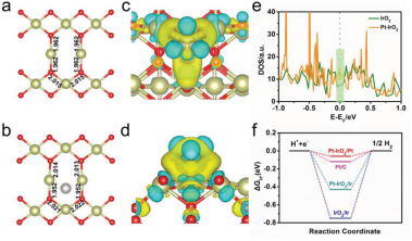 电化学CV处理及痕量Pt沉积后Pt与IrO2界面电荷差分图(a-d),总态密度(e)和三种催化剂表面的氢吸附自由能变化(f)。