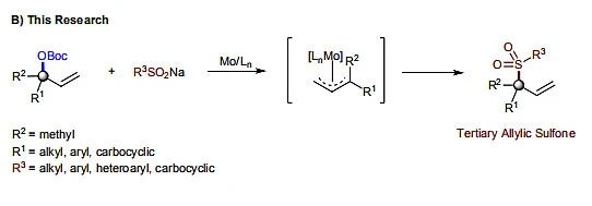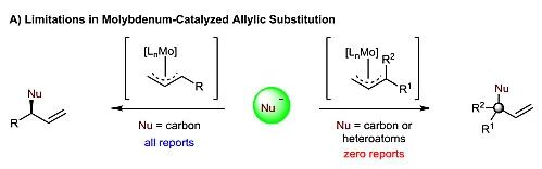 Tsuji于1965年提出π-烯丙基金属络合物的概念,此概念于1973年被Trost等用于合成反应。此后,基于该技术有机化学家创造出了多种新方法来合成或简单或复杂的分子,其中包括开发和利用杂原子亲核试剂,如氧、氮或硫基亲核试剂。尽管这一领域已取得巨大进展,但这些杂原子亲核试剂在过渡金属催化烯丙基取代反应中仍具有很大的发展空间。例如,钼催化的杂原子亲核试剂烯丙基取代反应是未知的,并且很大程度上仅限于碳-碳键的形成过程(图1左)。此外,烯丙基亲电试剂的底物范围也受到限制。