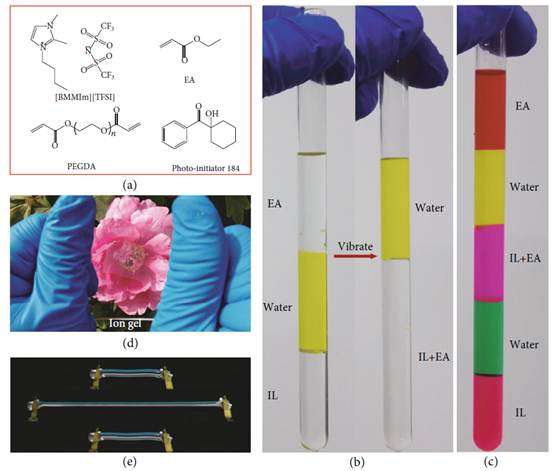 (a)离子凝胶前体的分子结构。离子液体(IL,[BMMIm] [TFSI]),聚合物单体EA,交联剂PEGDA。 (b)试管实验的照片,展示了EA和IL的疏水性,以及EA和IL的相容性。 (c)用IL,EA和水制成的有色分层鸡尾酒。 (d),(e)拉伸的疏水离子凝胶的照片,显示出材料优异的透明性和拉伸性。