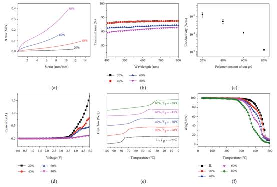 不同聚合物含量的离子凝胶的性能。20%,40%,60%和80%代表样品的聚合物含量。(a)离子凝胶的应力-应变曲线。 (b)离子凝胶在可见光范围内的透射率与波长的关系曲线,测试样品厚度为1毫米。(c)具有不同聚合物含量的离子凝胶的离子电导率。 (d)扫描速度为1 mV / s的离子凝胶的线性扫描伏安法(LSV)曲线。所有离子凝胶均显示出超过3.5 V的高分解电压。(e)离子凝胶的差示扫描量热法(DSC)曲线。DSC吸热曲线向上。曲线表明它们具有非常低的玻璃化转变温度(Tg),表明其低温耐受性。 (f)离子凝胶的热重曲线,显示分解温度超过300℃,表明具有极高的热稳定性。