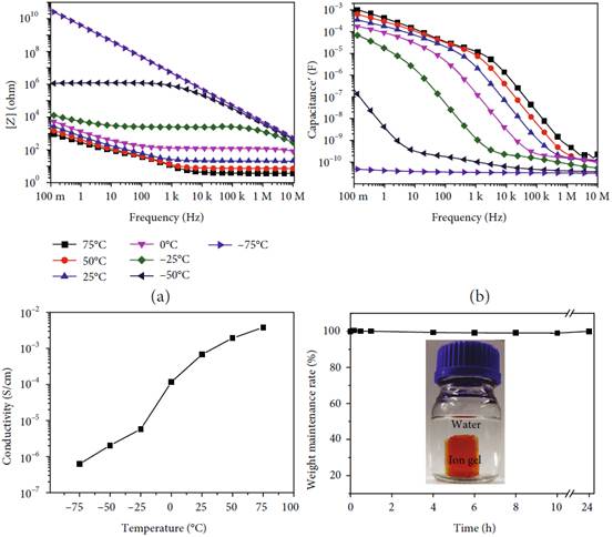 (a)变温下阻抗(| Z |)与频率的关系曲线。 (b)变温下电容与频率的关系曲线图。 (c)离子凝胶在不同温度下的电导率。 (d)在水中储存的离子凝胶的重量保持率对时间的曲线图,证明了其耐水性。在整个测试期间,其重量几乎没有变化,并且离子凝胶保持其原始形状。