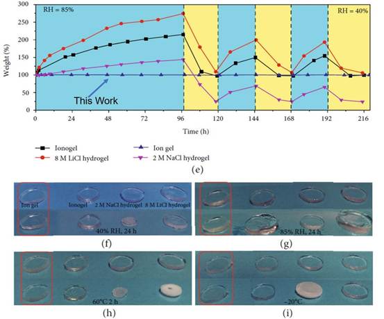(e)在不同的相对湿度(RH)下存储的几种离子导体的重量保持率与时间的关系图,表明了离子凝胶的湿度稳定性。测试温度为25℃。蓝色区域代表RH = 85%,黄色区域代表RH = 40%。 (f)在40%RH下存放24小时之前(上)和之后的离子导体的照片。 (g)在85%RH下存放24小时之前(上)和之后的离子导体的照片。 (h)在60℃加热2小时之前(上)和之后的几种离子导体的照片。 (i)在-20℃下储存之前(上)和之后的离子导体的照片。