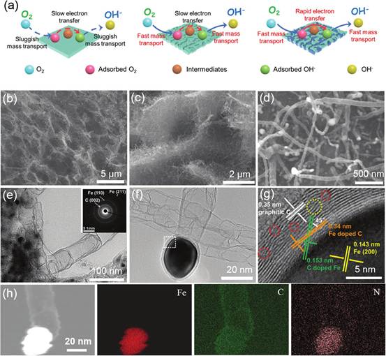 针对以上问题,西安交通大学理学院丁书江教授、肖春辉副教授课题组通过界面调控和结构设计制备了类水母状的Mott-Schottky催化剂,该催化剂可以促进ORR过程中的电子转移和质量传递。由于Mott-Schottky效应,电子在Fe和N掺杂的石墨化碳(NG)界面上重新分布,提高了催化位点的活性,有效促进电荷转移。半封闭的空腔结构和触手状的碳纳米管(CNTs)增强了活性物质和活性位点的碰撞,分层级的多孔结构提高了ORR过程中的质量传递。该工作加深了对ORR过程中电子转移和质量传递重要性的理解,并为构建高效的Mott-Schottky催化剂构建了新的途径。