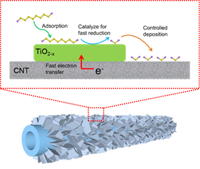 近日,西安交通大学丁书江教授课题组和剑桥大学郗凯博士从能带工程出发,通过简单的水热反应和后续的氢气还原过程,成功制备出富含氧缺陷的碳纳米管/二氧化钛超薄纳米片复合材料(CNT@TiO2-x)。作者利用理论计算表明氧缺陷和异质结可以协同提高材料的导电性和化学反应性。光谱学和电化学技术进一步证实了复合缺陷的超薄TiO2-x可以提高材料对多硫化物的吸附能力和表面锂离子迁移率。同时,CNT和TiO2-x构筑的异质界面可以实现快速的表面电子交换。得益于上述有益的特性,将该复合材料与LA132粘结剂混合得到的锂硫电池正极材料表现出超长的循环稳定性和高的面积比容量。该工作从新的视角去设计锂硫电池宿主材料并理解新型宿主材料在锂硫电池中的催化转化机制。