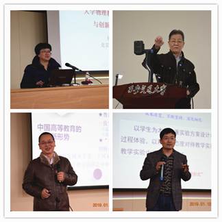 本次研修班从1月12日开班,为期两天,特邀北京大学钟锡华教授讲一堂名为“论波动光学中的三个反比律—兼评2018诺贝尔物理学奖”的课,从波动光学中三个反比律的理论价值和应用价值谈起,结合科技前沿详细介绍了其物理学基本规律的表达方法,讲解了其与量子力学中的不确定关系之间的关联,并对啁啾激光脉冲放大技术进行介绍。研修班还邀请教育部高等学校大学物理课程教学指导委员会委员、北京师范大学张萍教授,教育部高等学校大学物理课程教学指导委员会委员、兰州理工大学戴剑峰教授,高等教育出版社物理分社缪可可社长,西北工业大学工程实践训练中心主任李恩普教授,西北大学物理学院副院长郑新亮教授,西安理工大学理学院应用物理系主任、陕西省物理学会理事施卫教授,陕西师范大学物理学与信息技术学院高健智副教授,北京交通大学博士、第21届茅以升北京青年科技奖获得者陈征博士,西安交通大学物理实验中心副主任高博副教授和张倩老师为参加研修班的老师们做了精彩报告。