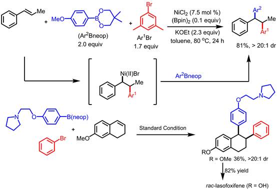 近日,西安交通大学理学院张志成课题组的新讲师高品博士与印第安纳大学布鲁明顿分校的Kevin Brown课题组通过筛选过渡金属催化剂、还原剂、溶剂等反应因子,成功地利用二氯化镍实现了苯乙烯类底物的1,2-双芳基化反应,该反应利用溴苯为亲电试剂、芳基硼酸酯为亲核试剂,甲苯为反应溶剂,在80摄氏度下反应24小时。此反应底物普适性很好,各种β-取代苯乙烯都可以顺利转化,且非对映选择性比例普遍高于20:1。芳基溴苯和芳基硼酸酯的取代基无论是吸电子的酯基、三氟甲基;还是给电子的甲氧基、甲基,都能以较高收率转化成目标产物。该反应可以放大到克级,产率和非对映选择性也令人满意。另外还成功地将此策略用于消旋拉索昔芬(lasofoxifene)药物分子前驱体的合成。