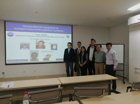 会后,Santos教授以“Nonequilibrium dynamics of isolated many-body quantum systems”为题为我院师生作了一场精彩的学术报告,向理学院师生介绍了在高度可控和封闭量子多体系统中,例如,冷原子与离子阱的长时间相干演化。报告中L.F. Santos教授以数值和解析的方法介绍了如何描述物理量从多体系统远离平衡直至演化到新平衡的演化过程。为学院师生揭开了不同时间尺度下的不同行为,并展示了通过分析时间演化展示如何提取系统频谱信息,以及通过动力学如何预测系统是否达到热平衡等。报告结束后,学院师生积极与L.F. Santos教授进行交流,极大地丰富了学院师生们的科学视野。