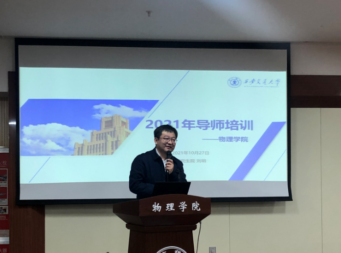 为全面落实研究生导师立德树人职责,加强研究生导师队伍建设。10月27日,物理学院在仲英楼组织开展研究生导师培训工作,邀请研究生院副院长刘明教授讲授研究生培养质量管理相关政策,学院全体在校研究生导师参加培训,学位办副主任徐渭、学位办贾丽萍受邀参加,培训会由院长助理穆廷魁主持。