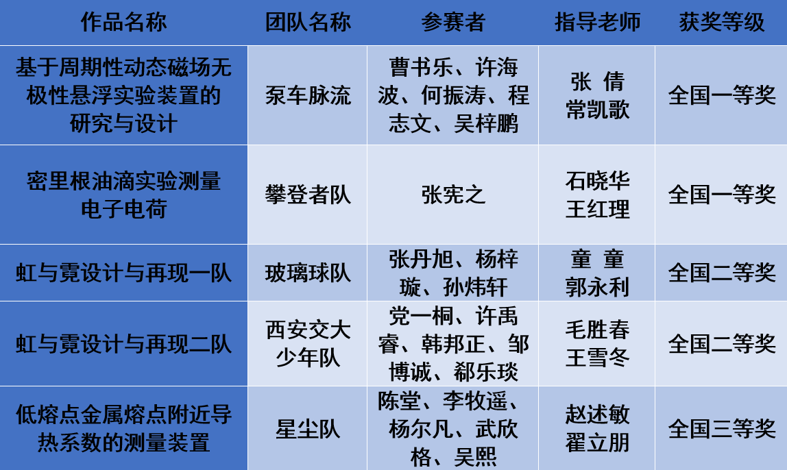 学校历来高度重视学科竞赛等各类创新创业活动。此次成绩的获得离不开实践教学中心、教务处等学校各职能部门的大力支持。比赛伊始,物理学院高度重视,由物理实验教学中心具体组织各参赛队经过周末培训、校赛选拔、校内集训、实战演练及答辩等环节,按竞赛组委会要求组织选拔5队参赛。指导教师和学生积极备战,经历近180天的高难度、大负荷的培训和鏖战,最终迎来可喜成果。命题赛道,泵车脉流队“基于周期性动态磁场无极性磁悬浮实验装置的研究与设计”获全国一等奖;玻璃球队与西安交大少年队“虹与霓设计与再现”双获全国二等奖;讲课赛道,攀登者队“密里根油滴法测电子电荷”获全国一等奖;自选赛道,星尘队“低熔点金属熔点附近导热系数的测量装置”获全国三等奖。最终取得我校在该赛事上获奖等级和类项的双突破,同时我校被大赛组委会评为“优秀组织单位”。