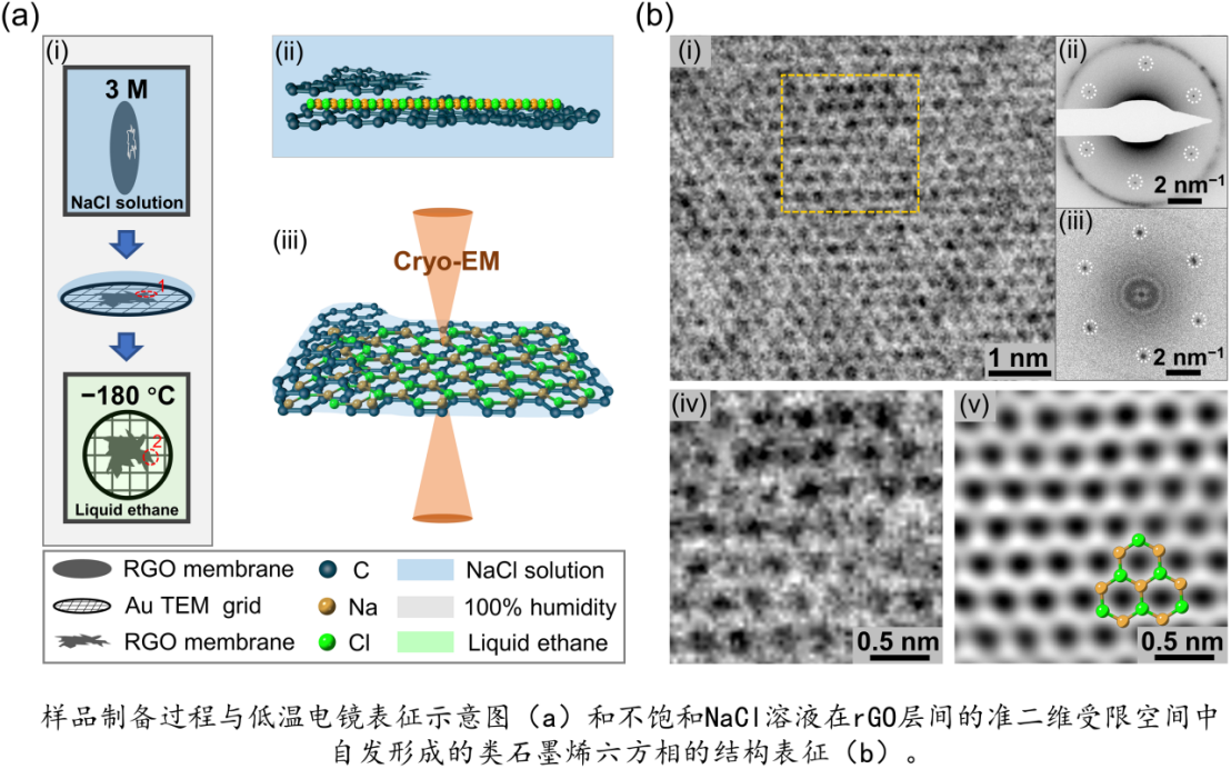 近日,西安交通大学物理学院张磊教授和张胜利教授课题组以冷冻透射电镜技术为基础,结合多种实验和理论分析方法,报道了环境条件下在水环境中还原氧化石墨烯(rGO)层间的准二维受限空间中由不饱和NaCl溶液自发形成的稳定类石墨烯六方相(h-NaCl),并实现了对这种六方相的近原子分辨率观察和原位表征。这是环境条件下类石墨烯六方NaCl相独立且稳定存在的首个实验证据。