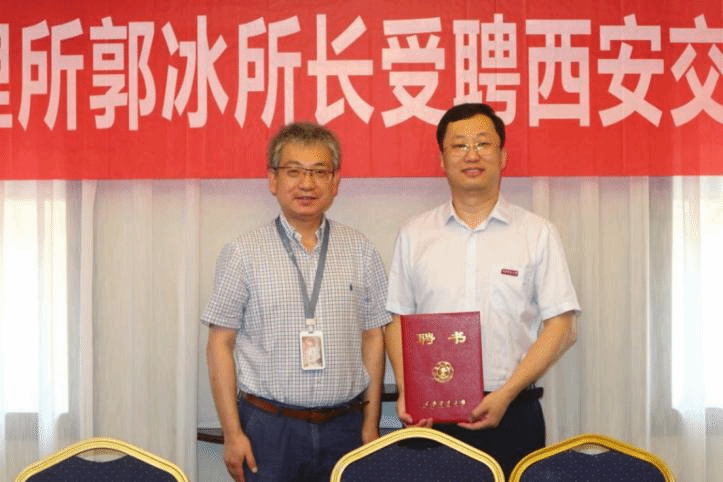 高宏向郭冰研究员颁发西安交通大学兼职教授聘书,并为郭冰佩戴校徽。