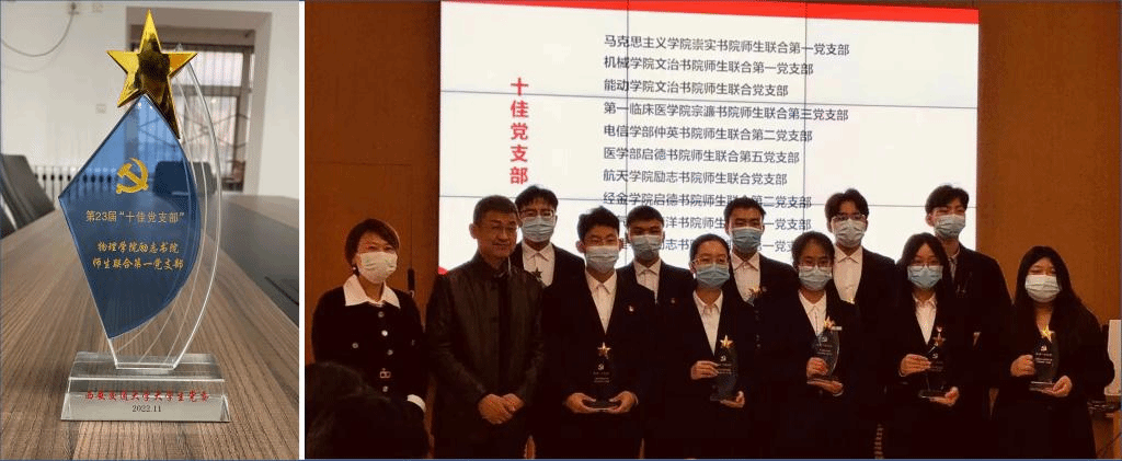 在西安交通大学第二十三届“十佳党支部”评选活动中,经推荐,学工部、大学生党委评审,原物理学院励志书院师生联合第一党支部荣获“十佳党支部”称号。