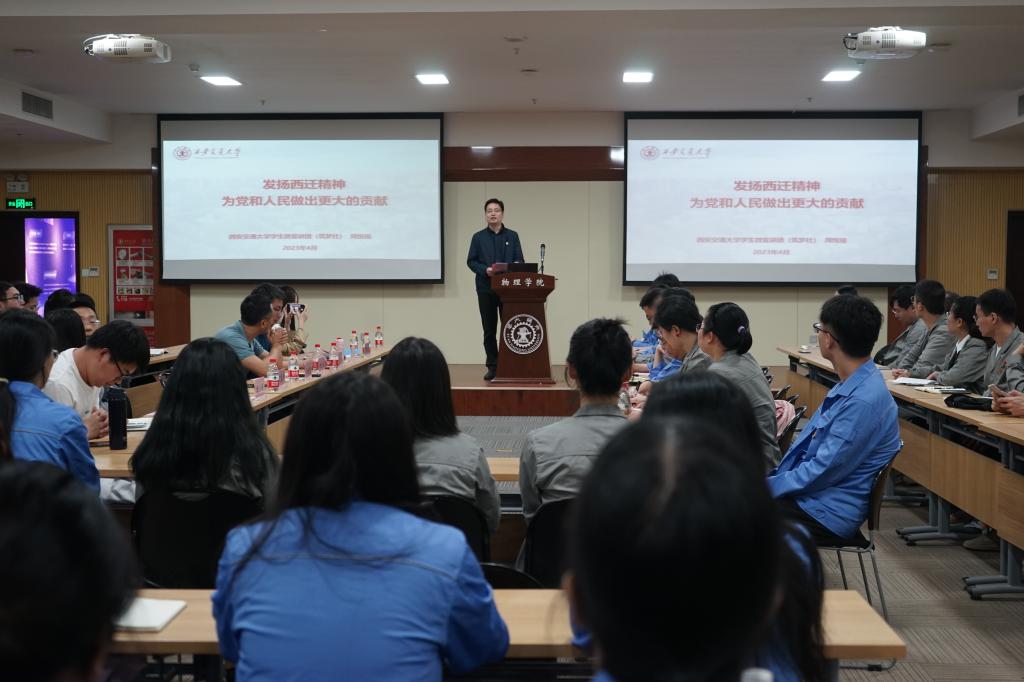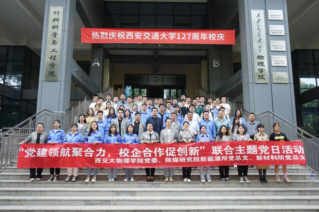 4月19日,陕煤研究院新材料技术研究所、新能源技术研究所来物理学院开展党组织共建活动,重温习近平总书记来陕来校考察重要讲话和重要批示指示精神,学习践行西迁精神,洽谈合作事宜。陕煤研究院新材料技术研究所党总支负责人、所长肖荣林,新能源技术研究所第一党支部负责人、副所长黄林泉等一行40余人来访交流。物理学院党委委员、副院长杨志懋,党委委员、物质所所长杨生春,院长助理孔春才,材物、机关、硕2021级、博材料、本科生师生联合等党支部党员代表参加学习活动,西安交大大学生微宣讲团宣讲人、南洋书院团委学生副书记周悦瑶同学受邀出席并做西迁精神宣讲报告。学习活动由孔春才主持。