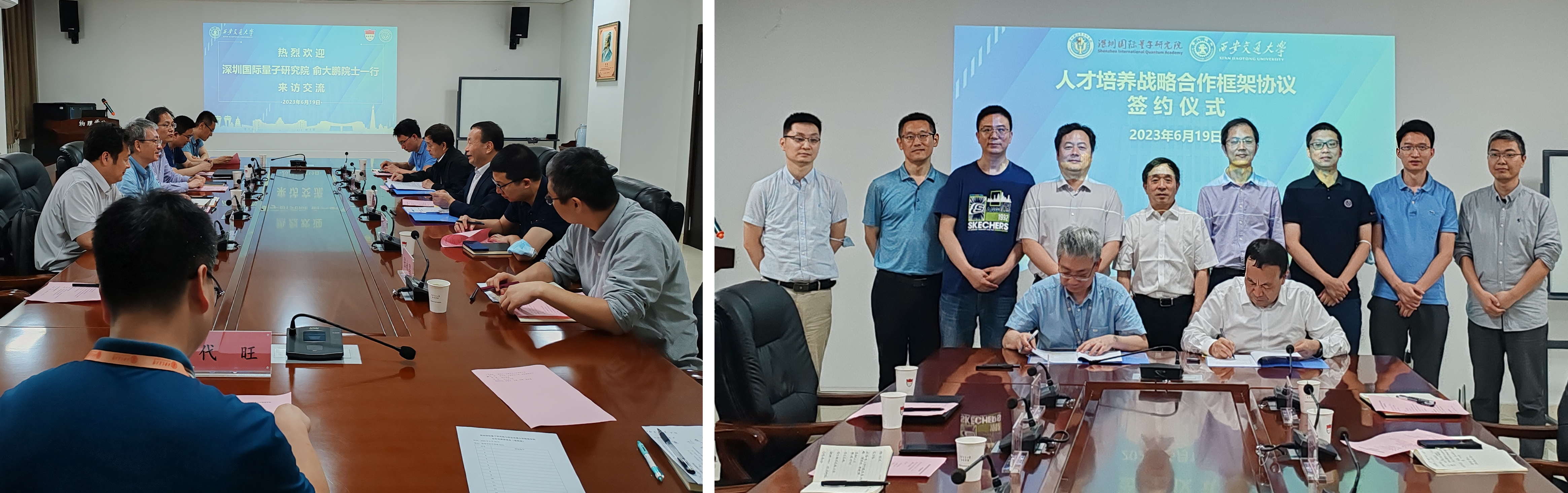 物理学院与深圳国际量子研究院就基础拔尖创新人才培养模式、校院协同育人责任与义务等相关情况进行座谈交流并签署“深圳国际量子研究院 西安交通大学物理学院人才培养战略合作框架协议”,双方希望能够共建共享学术资源,本着“优势互补、资源共享、合作共赢、共同发展”的原则,建立长期、稳定、可持续发展的合作伙伴关系,共同在物理学科建立联合培养体系,集中双方优势资源共同提升基础学科人才培养水平。