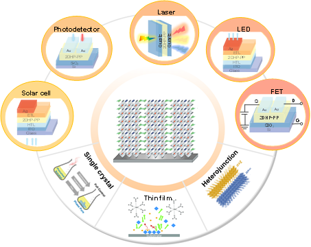 为此,西安交通大学物理学院杨生春和梁超课题组以及澳门大学邢贵川合作详细介绍了近年来大n准纯相二维卤化物钙钛矿的研究进程和最新进展。作者从大n准纯相二维卤化物钙钛矿的结构入手,介绍了大n准纯相二维卤化物钙钛矿形成机制、光电子学和物理性质。重点概述了基于大n准纯相二维卤化物钙钛矿的单晶、薄膜和异质结制备方法,为打破制备技术的限制提供了新的见解。此外,还充分挖掘了大n准纯相二维卤化物钙钛矿用于太阳能电池、光电探测器、激光器、发光二极管和场效应晶体管的优势。最后,讨论了大n准纯相二维卤化物钙钛矿这种新兴光电子材料所面临的挑战和前景,并展望了该领域潜在的技术发展。