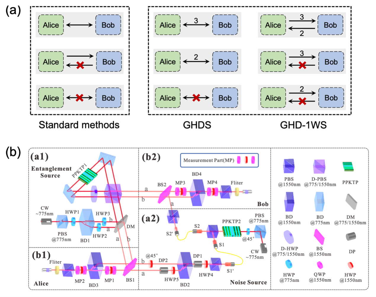 (a)高维单向量子导引新结构;(b)基于路径-偏振自由度高维纠缠系统的实验观测装置
