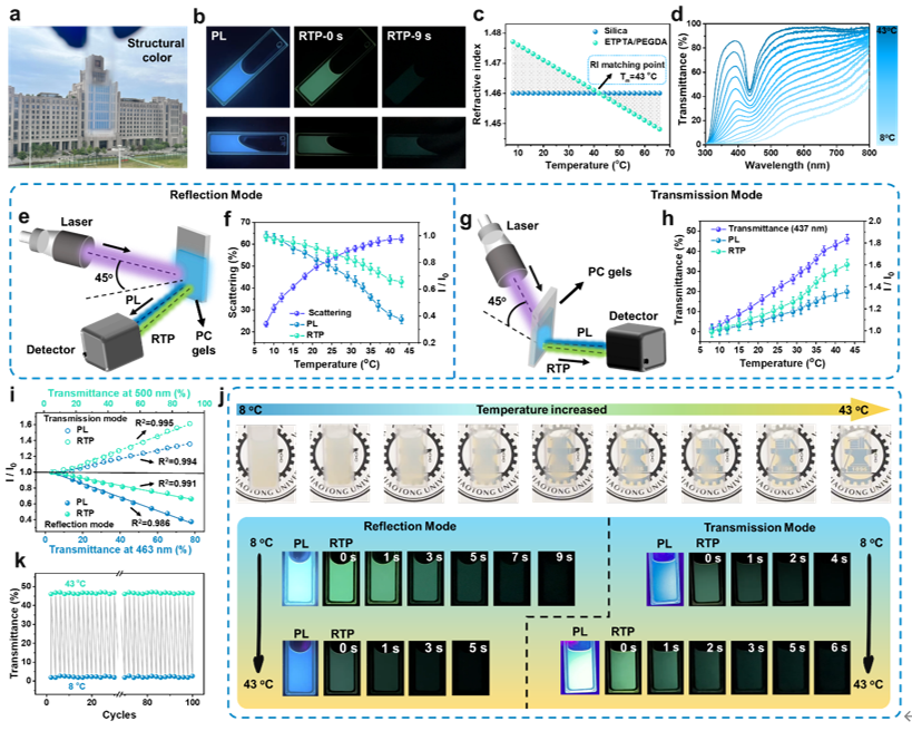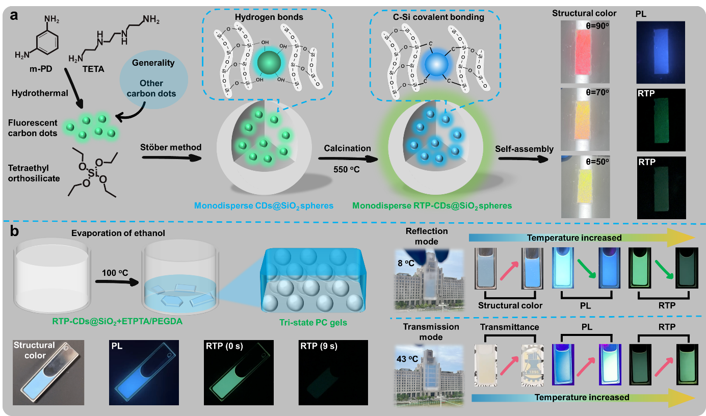 针对这一问题,西安交通大学物理学院研究人员提出了一种新颖的通用性策略来制备具有三重光学形态的光子晶体(三态PCs)。通过高温煅烧内部封装有荧光碳点(CDs)的SiO2纳米颗粒,形成具有规则形貌的单分散磷光SiO2纳米球(RTP-CDs@SiO2)并自组装成三态PCs。该PCs的三种光学模式在不同光源环境刺激下可以无缝切换,即在日光下具有虹彩结构色、紫外光照射时发出明亮的PL以及关闭紫外光后产生时间依赖的RTP。研究表明,高温煅烧产生磷光的内在物理机制是由于强C-Si共价键网络的形成进而稳定了激发三重态。进一步发现,磷光不依赖于所包裹CDs的表面缺陷类型或杂原子掺杂,因此证明所提出的制备方法具有通用性。此外,研究人员在该材料的基础上进一步实现了热响应三态光子凝胶。通过简单调整凝胶的环境温度(8oC-43oC),可以巧妙地将物理发光(结构颜色和透光率)与化学发光(PL和RTP)相联立,并且这些光信号在不同光传播模式下表现出互补偿特性。最后,研究人员展示了三态光子凝胶在可回收智能窗和多维信息加密等领域的应用场景,表明该材料在未来新型光学器件设计方面的广阔的应用前景。这一工作为物理色(结构色)和化学色(PL和RTP)的有机整合和系统集成开辟了新的途径,其丰富的光学性质有助于相关材料及光学器件的设计、研究向更高水平发展。