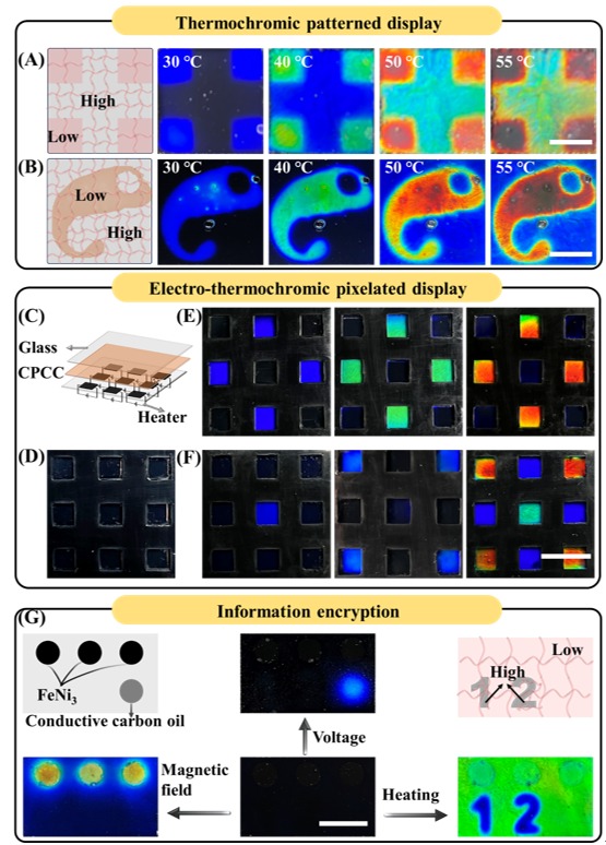 图5 HPC-P(AA-AM)复合材料在热致变色显示、电热驱动像素化显示及热-电-磁驱动的信息加密中的应用