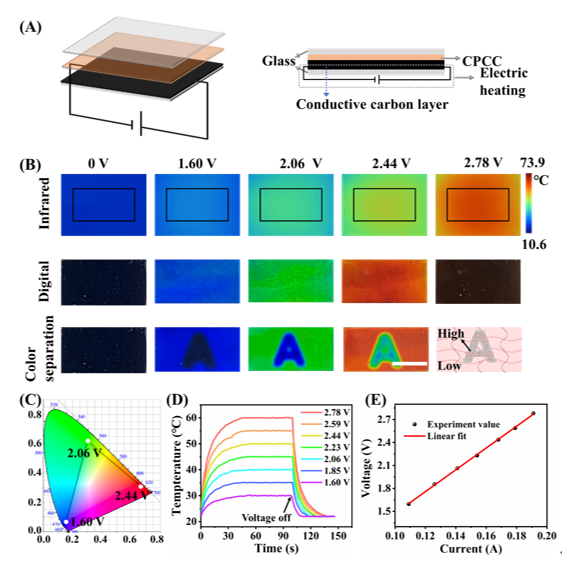 为了进一步实现结构色的电刺激调控,将CPCC与导电碳油结合,利用导电碳油形成的碳层作为导电基底,通过施加电压在碳层中形成的电流产生的焦耳热对上层CPCC进行加热,进而实现结构色的动态调控。由于CPCC优异的热响应能力,所形成的薄膜在0~3V的电压下即可实现结构色在整个可见光范围的调控;同时通过对复合体系中水凝胶交联度的局部调控,所形成的CPCC薄膜表现出低电压驱动的多色分离能力,如图3所示。