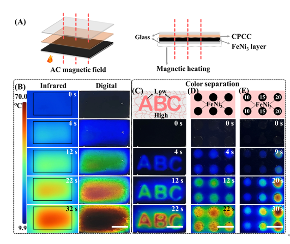 同样基于CPCC的热敏特性,结合FeNi3磁性合金纳米粒子优异的磁热性能,设计了一种可通过磁场进行多色分离的方法。在高频交变弱磁场作用下,FeNi3纳米粒子可通过磁滞损耗、弛豫损耗等方式将磁场能高效地转变为热能,从而对纤维素薄膜进行快速加热,实现磁场诱导下的结构色动态调制。进一步利用FeNi3纳米粒子在基底中的像素化分布及浓度变化,可实现各像素点结构色的独立调控,从而获得弱磁场作用下的多色分离和像素化显示效果,如图4所示。