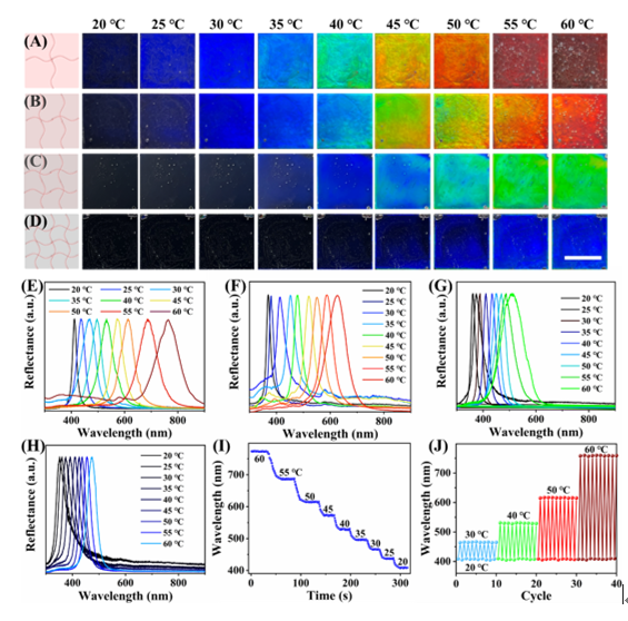 针对这一课题,西安交通大学物理学院研究团队借鉴变色龙的色彩调控策略,通过将羟丙基纤维素(HPC)与聚(丙烯酸-丙烯酰胺)(P(AA-AM))水凝胶结合,成功制备了具有多色分离能力的胆淄相纤维素复合材料(CPCC)。由于复合体系中胆淄相HPC的螺距随温度升高而增大,且螺距变化范围受复合体系中水凝胶交联度的影响,因此可以通过改变水凝胶的交联度来调控HPC结构色对温度的响应行为,进而实现温度诱导下的多色分离,如图1所示。研究发现,提高HPC的浓度可以有效降低胆淄相HPC的螺距,并使得高浓度下不同交联度的CPCC在室温下的反射峰波长始终处于紫外区域,即室温下始终不显示结构色,材料呈透明状态;而随着温度升高,胆淄相HPC的螺距逐渐增大,反射峰波长逐渐红移进入可见光波段,从而表现出温度诱导的多色分离现象,如图2所示。这一发现为以温度为密匙的防伪材料的设计提供了新的思路。