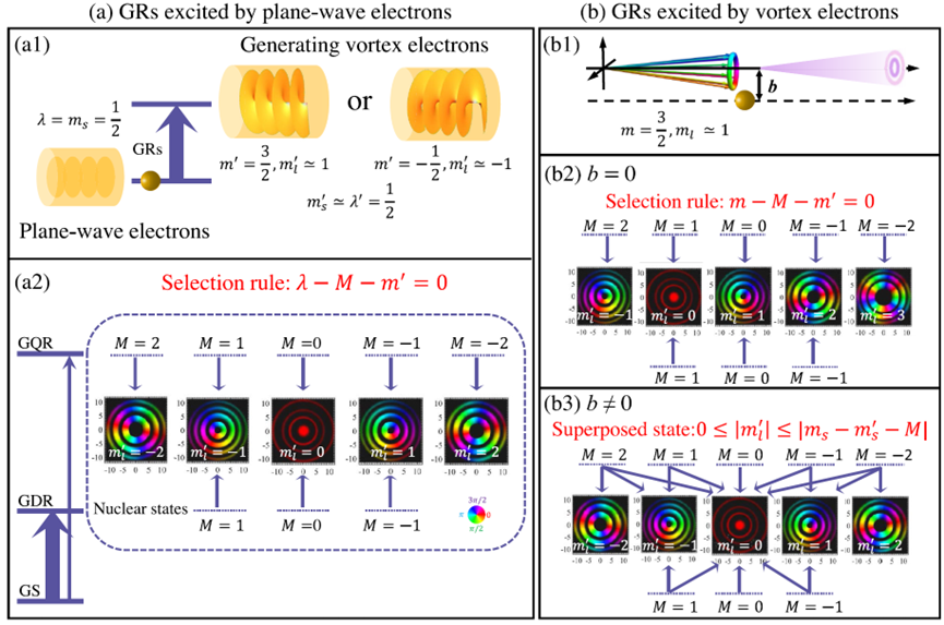 该工作基于准粒子无规相位近似模型,将电子的轨道角动量引入传统理论框架中,发展了角动量分辨的非弹性散射理论。研究发现,无论平面波还是涡旋电子激发巨共振,散射电子的角动量状态均与原子核磁量子数M相关联,通过精确测量散射电子态,可实现多极共振跃迁强度的模型无关提取。此外,平面波电子激发巨共振可有效产生具有轨道角动量的涡旋电子;而涡旋电子激发巨共振的微分散射截面与碰撞参数的依赖关系,为探测相对论高能涡旋电子的角动量提供了新方法。该研究揭示了轨道角动量在调控核跃迁中的关键作用,为核结构的理解开辟了新的视角,并为高能涡旋电子的产生和探测提供了新的可能性,激发了对涡旋电子应用的深入探索。