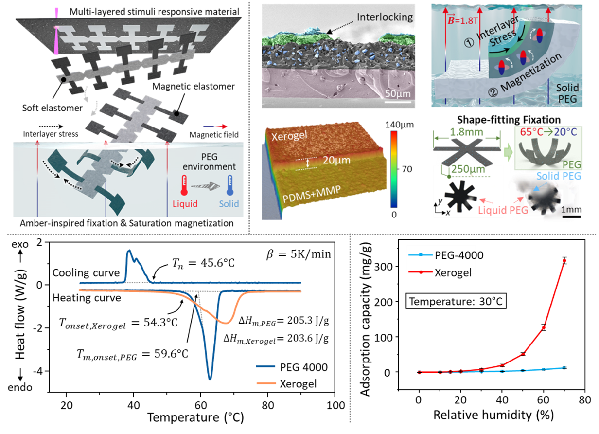 针对这一问题,西安交通大学物理学院先进功能材料与器件物理团队青年优秀教师韩捷等受“琥珀固化”现象的启发,提出了一种无需模板的三维磁畴编程新策略。团队构建了由干凝胶、激光诱导石墨烯(LIG)与磁弹性体组成的三层异质材料体系,利用其三维互联微孔道结构,实现超亲水-超疏水界面的稳定连接。干凝胶层在温/湿场中收缩,诱发层间应力,从而驱动微结构实现精确三维变形。随后采用高精度的飞秒/皮秒激光加工技术,实现逐层构型与应力编程图案化,特征尺寸优于20μm,具备秒级制备效率。最终在饱和磁场下完成磁化,并通过水洗去除PEG和干凝胶层,成功实现了微型磁控软体机器人的一致性、批量化制备。该研究不仅提出了一种全新的磁畴编程范式,同时为物理智能微型机器人在生物医疗、微流控及智能集群等领域的应用奠定了基础。