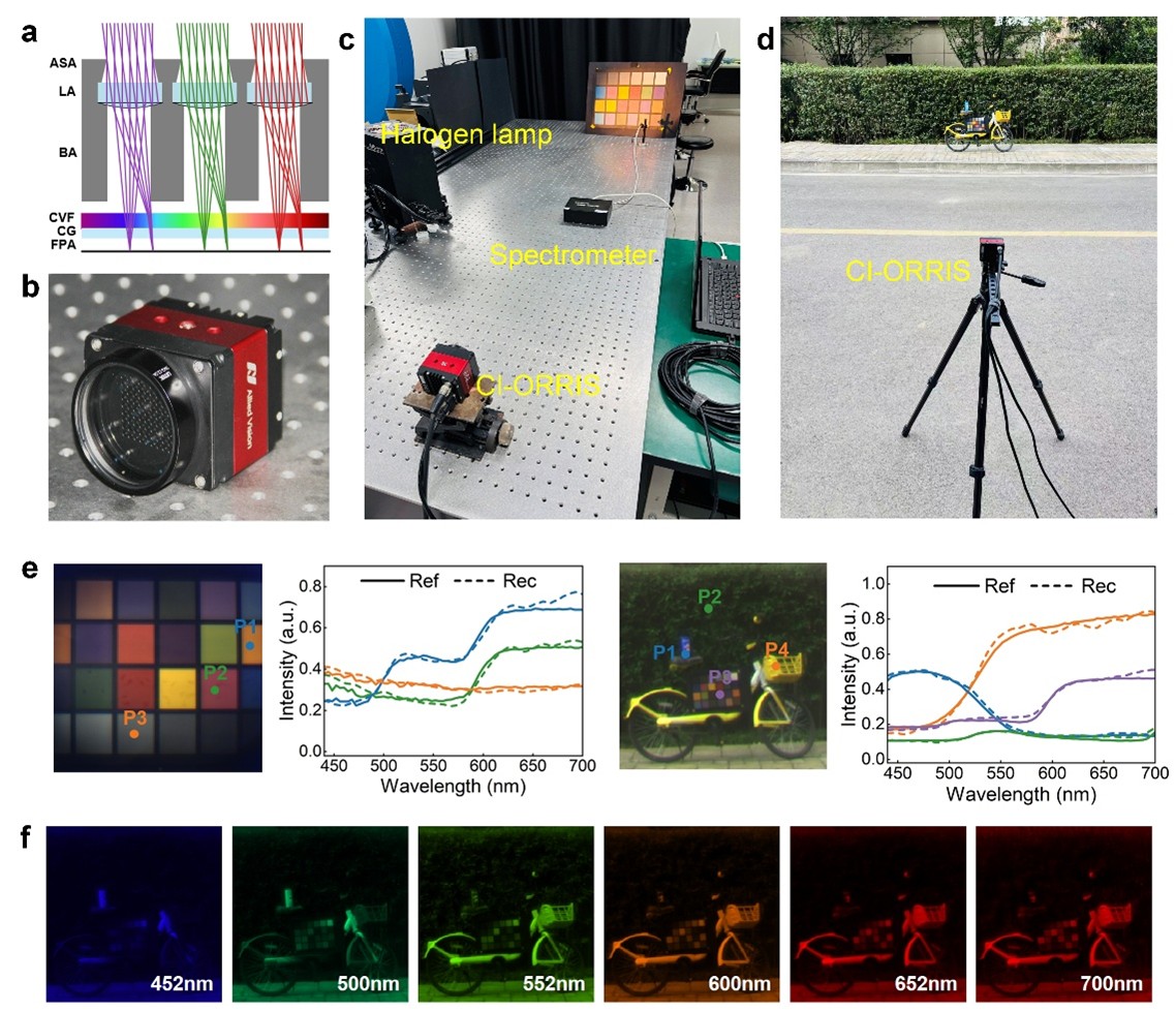 近日,西安交通大学物理学院空间光学研究所穆廷魁教授团队,在快照式光谱成像领域取得了新进展。该团队创新性地提出了“多空间-光谱编码(MSA-SE)”机制,通过构建“空间编码+光谱编码+空间复用增强”的高维像素级编码模型,有效增加了编码信息量进而提升光谱重构精度。在软件上,开发了基于Transformer的深度学习重构网络和性能指标评价约束算法。在硬件设计上,将MSA-SE模型集成至自主研发的微型化光谱成像系统ORRIS(Optics Letters 44, 1281-1284,2019;Optics and Lasers in Engineering 169, 107717-1-15,2023),构建了CI-ORRIS系统,可在单次曝光中获得多张具有不同空谱编码测量的子图像。实验结果表明,CI-ORRIS系统具有良好的窄带和宽带光谱重建性能,最高光谱分辨率达3.7 nm。同时系统可在单次快照下重建440-700 nm波段的66个波长通道,并成功用于室内外复杂场景的光谱成像与分析,实现了单次曝光下的多次编码测量,大幅提升光谱分辨率,具备更高的系统灵活性与应用适应性。
