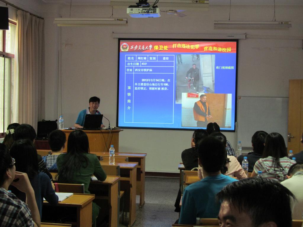 培训的第一讲邀请学校保卫处治安二大队高鸿洲队长为大家就近期校园安全情况作了通报。高老师通过图片、视频等原始资料向大家生动的再现了在校园里,在同学们身边发生的一些真实案例,以此警醒广大学生要增强安全防范意识,防微杜渐,做好人身财产安全的保护措施,特别是要注意实验室安全隐患等。