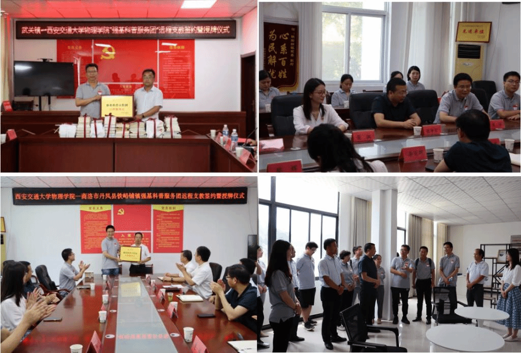 6月23日,物理学院机关党支部、硕2021级党支部联合陕西省人社厅前往丹凤县武关镇、铁峪铺镇开展“强基科普宣讲团”活动,共谋校地联合发展,助力乡村教育振兴。陕西省人社厅专业技术人员管理处副处长张争京、宣传中心副主任樊帅、驻武关镇人才驿站博士、铁峪铺镇党委副书记(挂职)荣飘一同前往。物理学院党委副书记张沛教授、副院长杨志懋教授带队参加活动。丹凤县副县长郝浩及县人社局、科教体局主要负责同志和丹凤县武关镇、铁峪铺镇党委班子成员出席了各项合作对接活动。