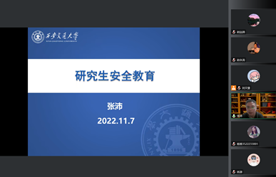 最后由张沛副书记为同学们进行研究生安全教育。他从政治安全、宿舍安全、实验室安全、财产安全、疾病安全和身心健康六个方面展开,帮助同学们提高安全意识,增强防范和抵御风险的能力。他指出,同学们作为新时代的研究生要增强自己的政治意识,保守国家秘密,规范网络言论,同时一定要保护好自己的人身及财产安全,健康快乐的度过自己的研究生阶段。
