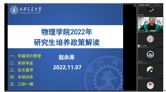首先由赵永涛副院长为同学们介绍物理学院研究生培养管理政策。他重点就研究生学籍学历管理规定、奖助学金、论文督导、专硕培养、三助一辅五个方面为同学们详细讲解了学院研究生培养管理政策。他强调学位论文是研究生学习、科研、实践的重要组成部分,鼓励同学们一定要端正自己的科研态度,培养良好学风,学有所得,写出合格的高质量的学位论文。